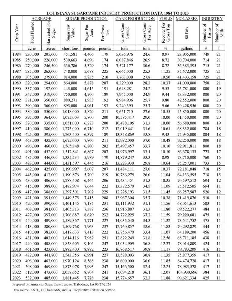 Louisiana Sugarcane Production Data 1984-2025