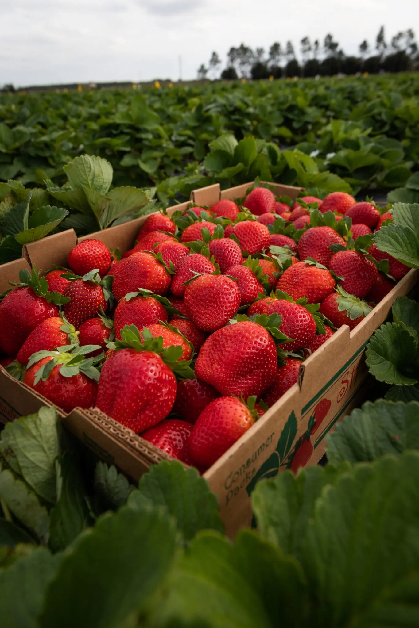 A box of strawberries in a field. Photo taken 02-05-20.