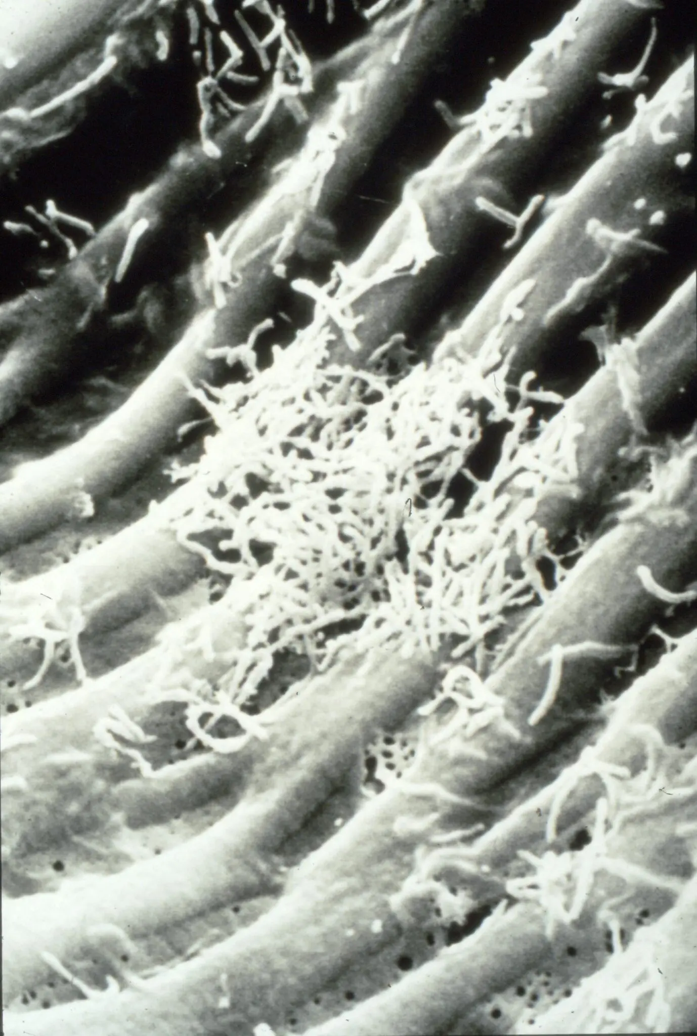 An electron micrograph showing the bacteria that cause RSD inside a cane plant water vessel.