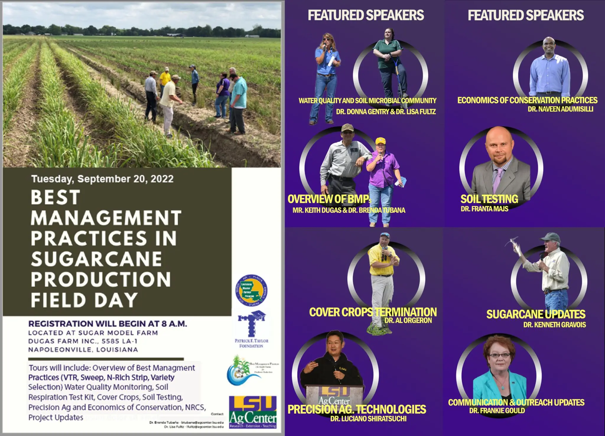 The Fall LSU AgCenter Best Management Practices in Sugarcane Production Field Day will be held Tuesday, September 20 at Dugas Farm, 5585 La. Hwy 1 in Napoleonville. Registration starts at 8 a.m.