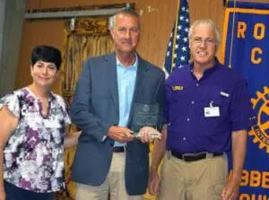 Rotary Club of Abbeville President Annette Mudd and Rotarian Mark Shirley (right) present Bryan Simon with the “Farmer of the Year” Award. Photo by VermilionToday.com